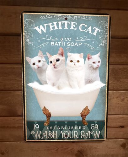 White Cat Bath Soap 8x12 Metal Wall Sign Animal Poster